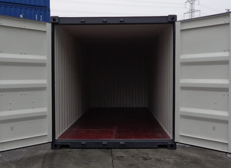 El contenedor está equipado con dos puertas robustas que se abren hacia el exterior por un solo lado, con un sistema de cierre seguro que incluye 4 pestillos verticales. Las puertas se abren hasta un ángulo de 270 grados.